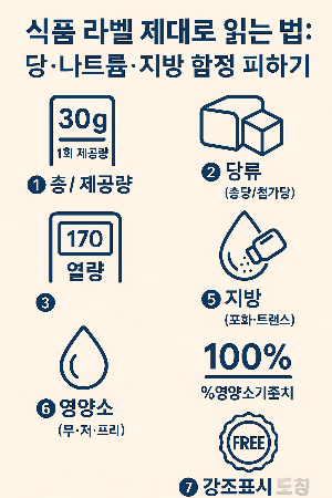 멋진 문구보다 중요한 건 숫자입니다. 1회 제공량과 실제 섭취량을 맞춰보고, 당·나트륨·포화/트랜스지방의 절대량과 %기준치를 동시에 보세요. WHO의 당·나트륨 권고, 국내 표시기준을 생활 속에 적용하면 야외·배달·간편식 중심의 식생활에서도 충분히 ‘건강한 선택’을 할 수 있습니다. 작은 습관의 반복이 중장기 건강지표(혈압·체중·혈당·지질)를 바꿉니다.